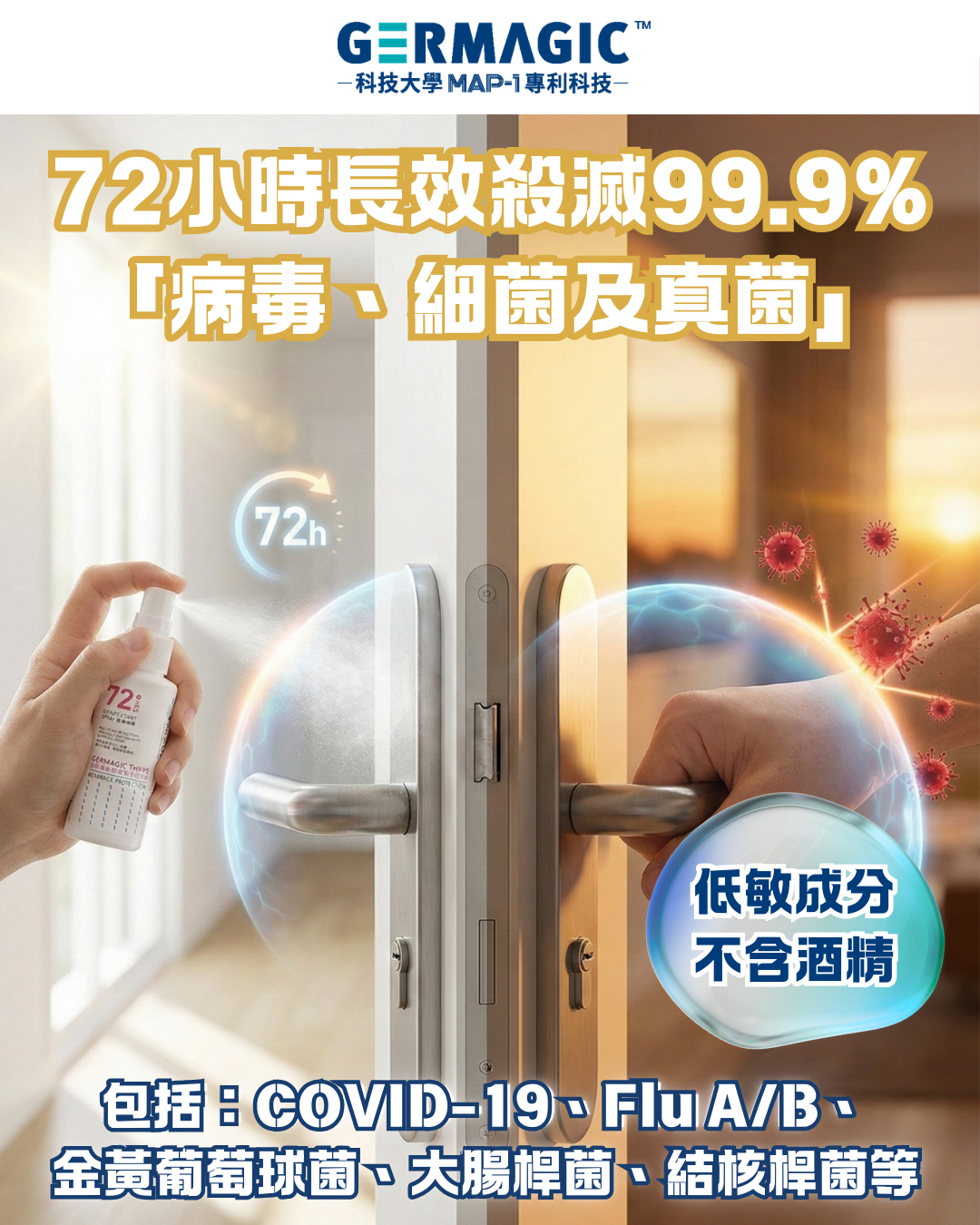 GERMAGIC™ Multi-Pro72 Disinfectant Spray features a "long-lasting smart antibacterial coating" developed by the Hong Kong University of Science and Technology Joint Laboratory.72-hour long-lasting killing of 99.9%* "viruses, bacteria and fungi", suitable for hands or body skin, and can also be used on different object surfaces, it is definitely a multi-purpose disinfectant spray!