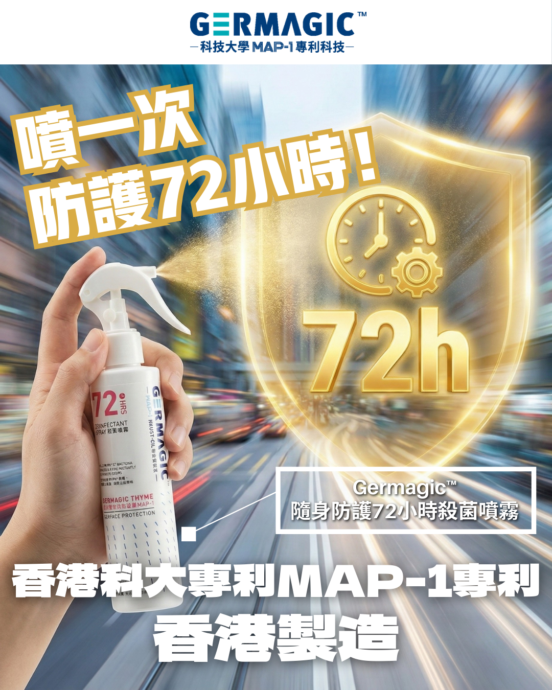 GERMAGIC™ Multi-Pro 72 消毒噴霧採用香港科技大學聯合實驗室研發的「長效智慧抗菌塗層」。72小時長效殺滅99.9%* 「病毒、細菌及真菌」, 適用於雙手或身體皮膚上,更可用於不同物件表面,絕對是一支多用途的殺菌噴霧!